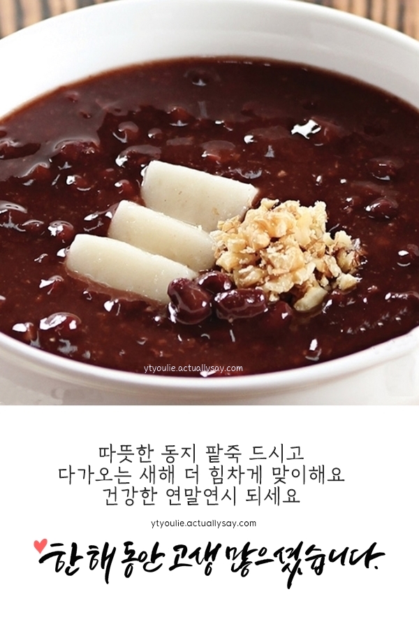 한 해의 끝자락, 붉은 팥죽의 따스함으로 몸도 마음도 데우는 동짓날입니다. 오랜 전통처럼 정을 나누는 이 시간이 올 한 해를 잘 마무리할 수 있게 도와주기를 바랍니다. 사랑하는 사람들과 함께 따뜻한 하루 보내시길 바랍니다.