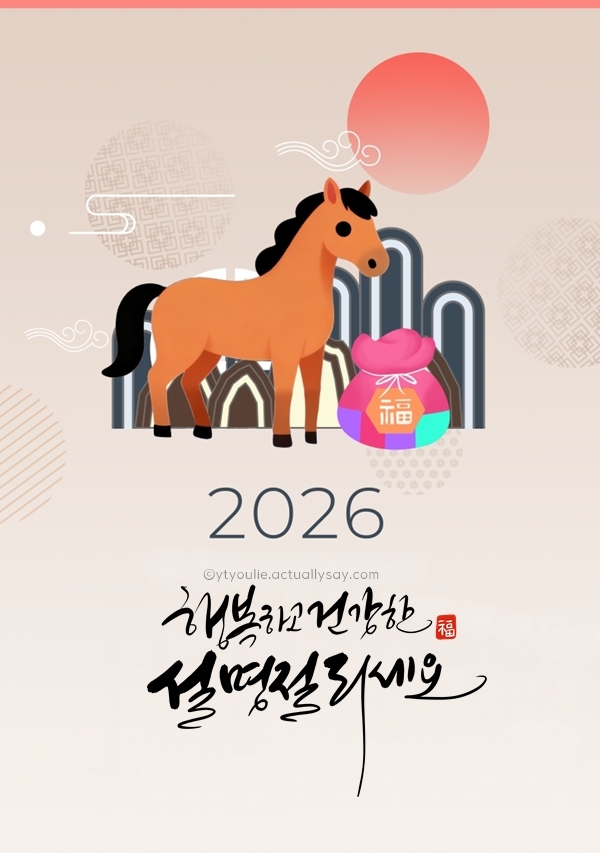 "새로운 한 해가 시작되는 설날, 2026년 병오년의 기운은 그 어느 때보다 역동적입니다! 붉은 말처럼 힘차게 대지를 박차고 나가는 도약의 기운을 받아, 당신의 건강과 성취가 역대급 기록을 갱신하는 한 해가 되길 바랍니다. 가정에는 늘 건강이라는 튼튼한 울타리가, 하시는 일에는 '술술 풀리는 마법'이 깃들기를 진심으로 응원할게요!"