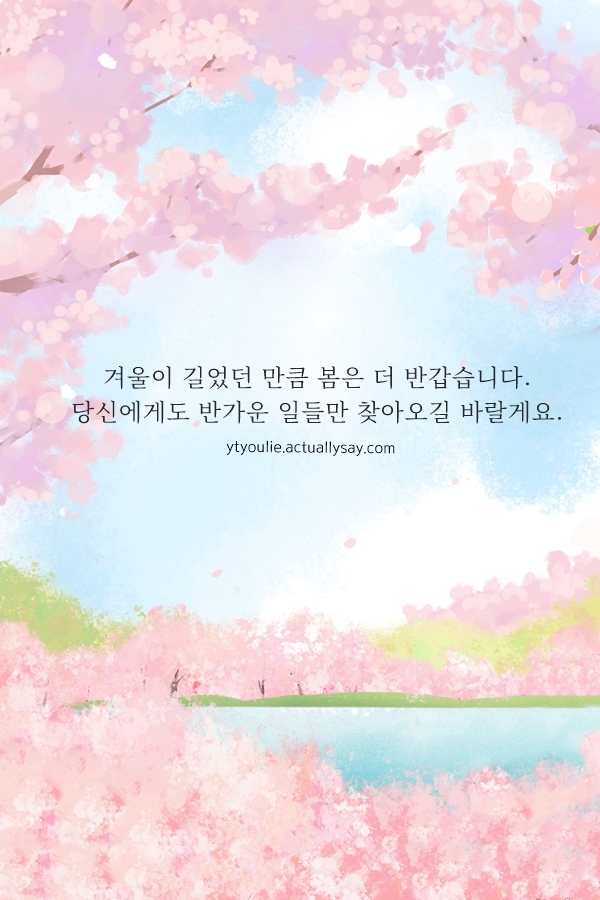 누군가에게 다가가 봄이 되려면 내가 먼저 봄이 되어야 한다는 말처럼, 이번 주말은 자신을 먼저 사랑해 주세요. 내가 행복해야 주변 사람들에게도 따뜻한 봄을 전해줄 수 있으니까요. OO님만의 소박한 행복으로 가득 찬 주말 보내시길.